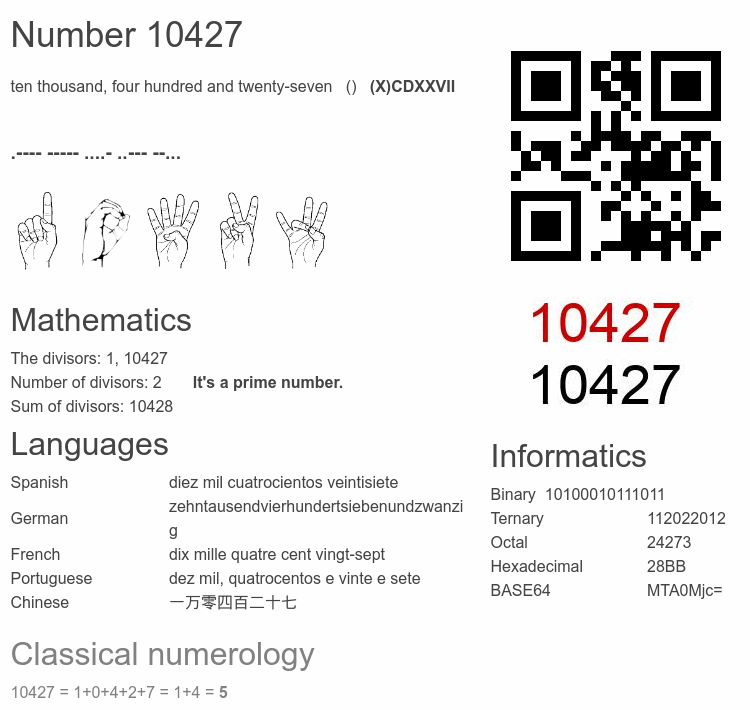 | Spanish: | 🔊 (número 10.427) | diez mil cuatrocientos veintisiete |