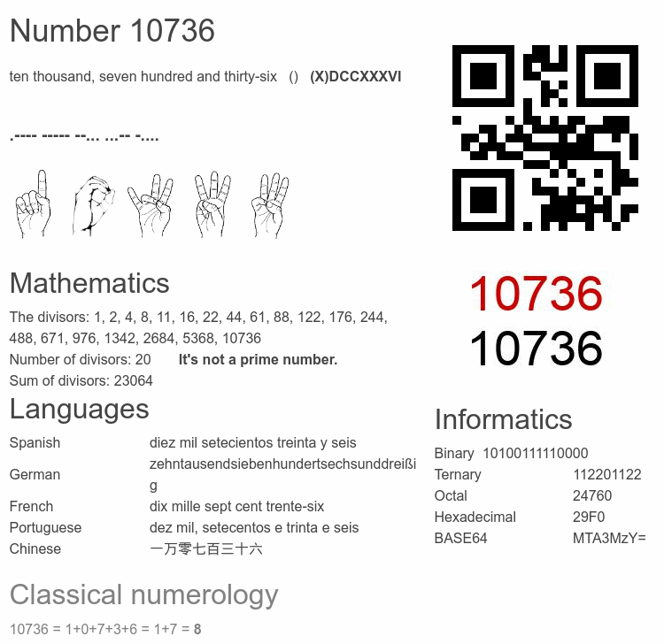 | Portuguese: | 🔊 (número 10 736) | dez mil, setecentos e trinta e seis |
