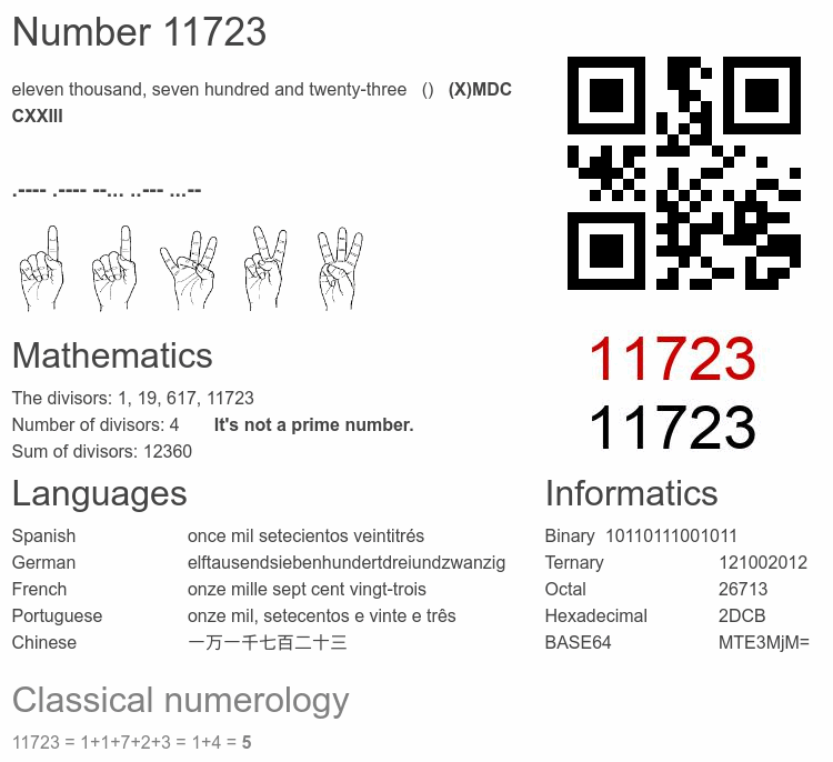 | Spanish: | 🔊 (número 11.723) | once mil setecientos veintitrés |