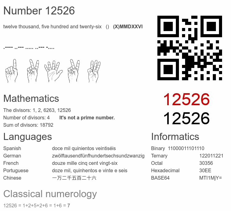 The even number 12,526 is spelled 🔊, and written in words: twelve thousand, five hundred and twenty-six. The ordinal number 12526th is said 🔊 and written as: twelve thousand, five hundred and twenty-sixth. The meaning of the number 12526 in Maths: Is it Prime? Factorization and prime factors tree. The square root and cube root of 12526. What is 12526 in computer science, numerology, codes and images, writing and naming in other languages. Other interesting facts related to 12526.
