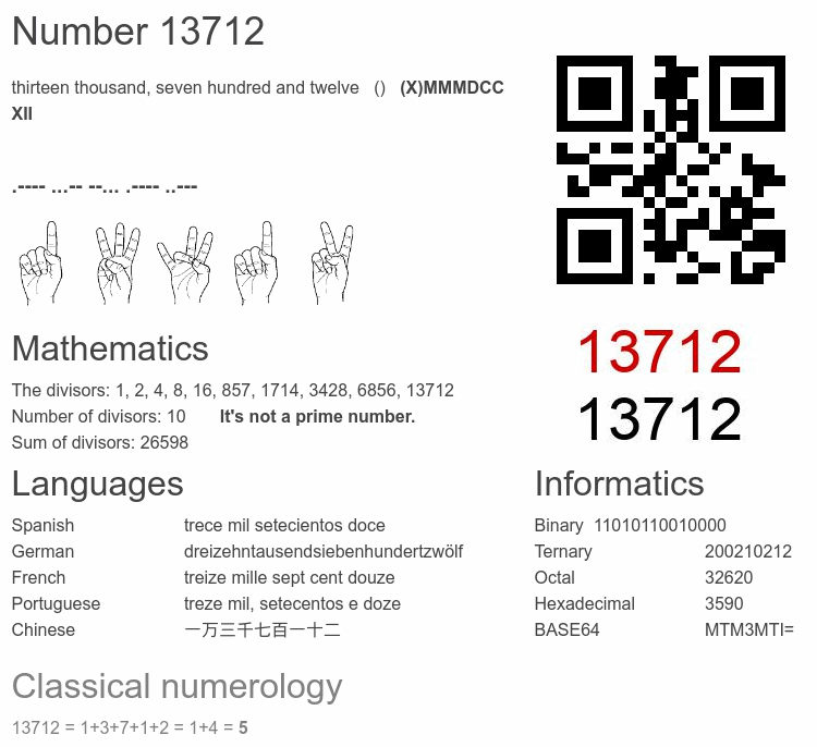 | Spanish: | 🔊 (número 13.712) | trece mil setecientos doce |