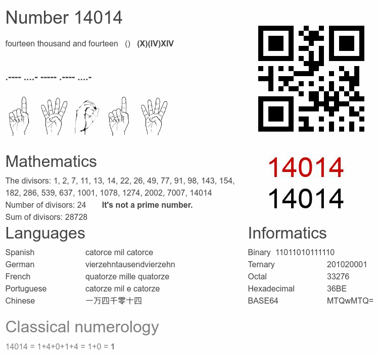 | Spanish: | 🔊 (número 14.014) | catorce mil catorce |