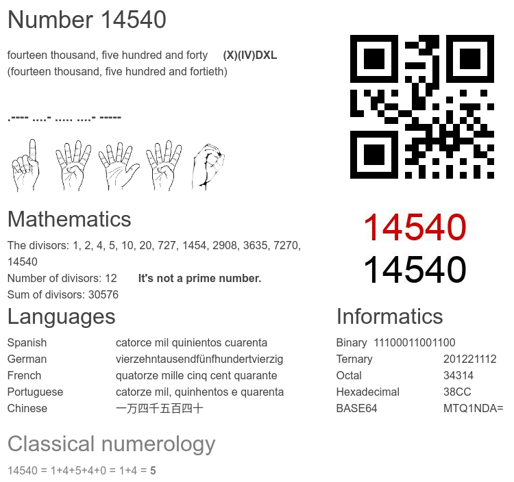 | Portuguese: | 🔊 (número 14 540) | catorze mil, quinhentos e quarenta |