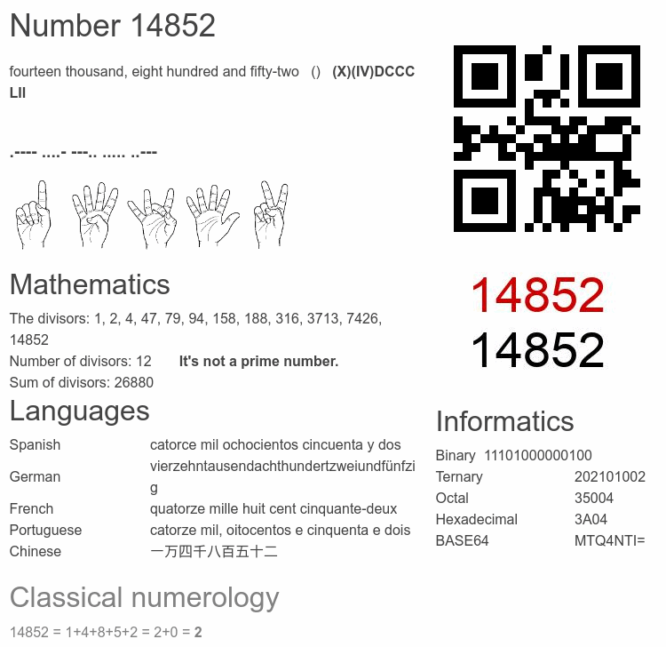 The even number 14,852 is spelled 🔊, and written in words: fourteen thousand, eight hundred and fifty-two. The ordinal number 14852nd is said 🔊 and written as: fourteen thousand, eight hundred and fifty-second. The meaning of the number 14852 in Maths: Is it Prime? Factorization and prime factors tree. The square root and cube root of 14852. What is 14852 in computer science, numerology, codes and images, writing and naming in other languages. Other interesting facts related to 14852.