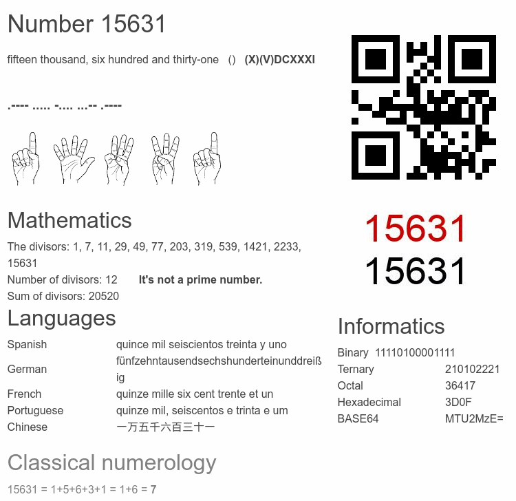 | Spanish: | 🔊 (número 15.631) | quince mil seiscientos treinta y uno |