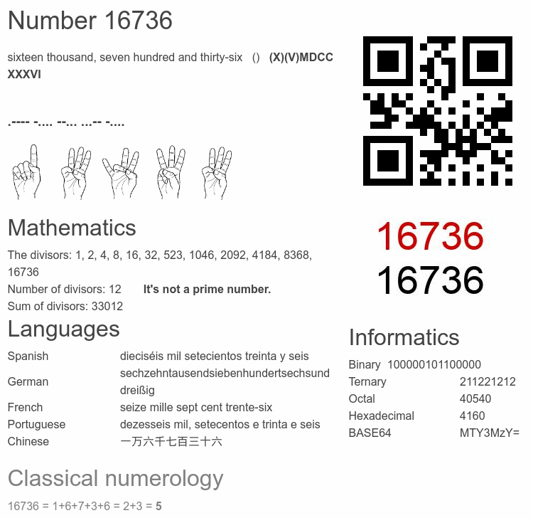 If you know something interesting about the 16736 number that you did not find on this page, do not hesitate to write us here.