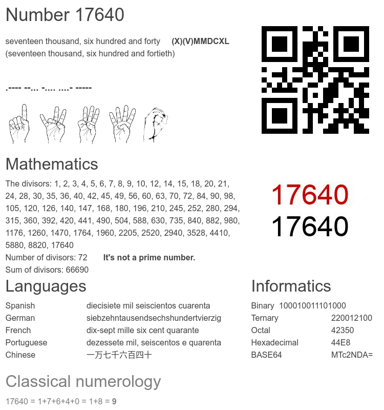 The even number 17,640 is spelled 🔊, and written in words: seventeen thousand, six hundred and forty. The ordinal number 17640th is said 🔊 and written as: seventeen thousand, six hundred and fortieth. The meaning of the number 17640 in Maths: Is it Prime? Factorization and prime factors tree. The square root and cube root of 17640. What is 17640 in computer science, numerology, codes and images, writing and naming in other languages. Other interesting facts related to 17640.