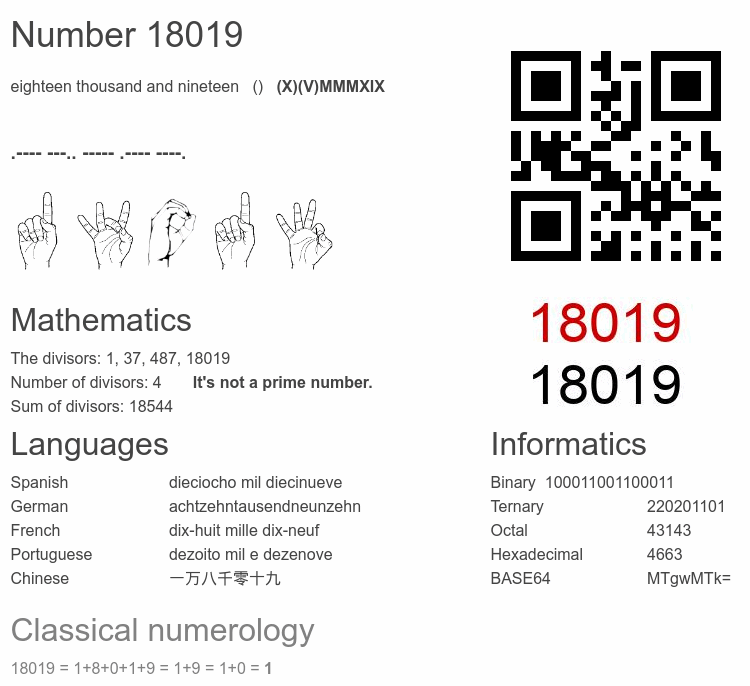 | Portuguese: | 🔊 (número 18 019) | dezoito mil e dezenove |