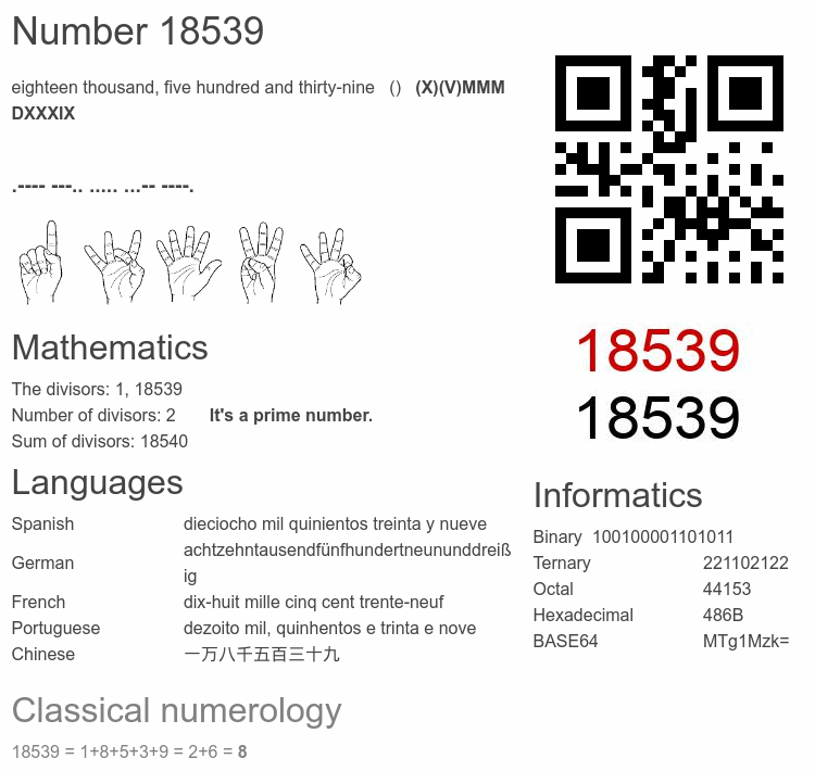 The odd number 18,539 is spelled 🔊, and written in words: eighteen thousand, five hundred and thirty-nine. The ordinal number 18539th is said 🔊 and written as: eighteen thousand, five hundred and thirty-ninth. The meaning of the number 18539 in Maths: Is it Prime? Factorization and prime factors tree. The square root and cube root of 18539. What is 18539 in computer science, numerology, codes and images, writing and naming in other languages. Other interesting facts related to 18539.