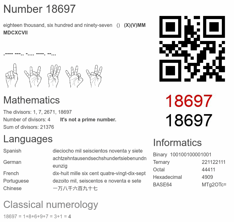 | Portuguese: | 🔊 (número 18 697) | dezoito mil, seiscentos e noventa e sete |