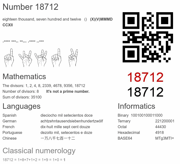 | Arabian: | 🔊 (عدد 18,712) | ثمانية عشر ألفاً و سبعمائة و اثنا عشر |