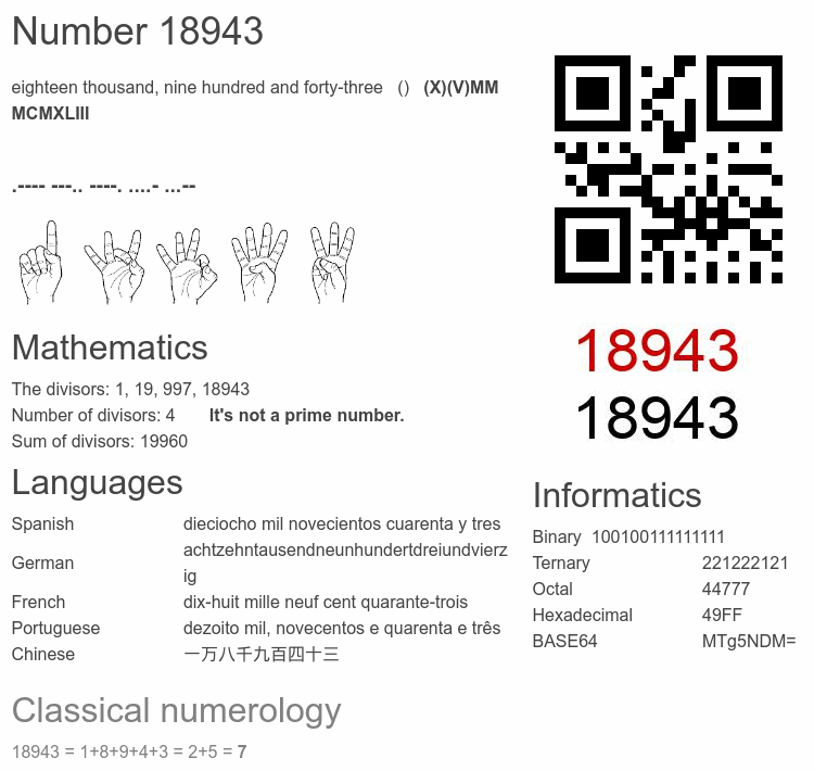 If you know something interesting about the number 18943 or any natural number (positive integer), please write to us.What is 18,943 in other units