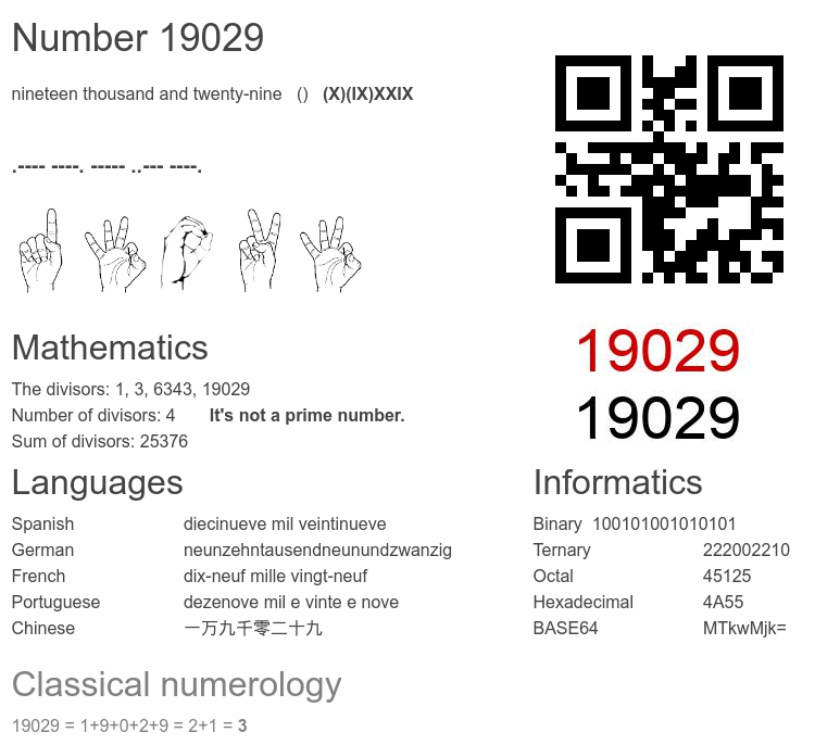 | Spanish: | 🔊 (número 19.029) | diecinueve mil veintinueve |