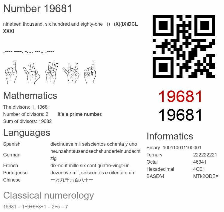 | Portuguese: | 🔊 (número 19 681) | dezenove mil, seiscentos e oitenta e um |