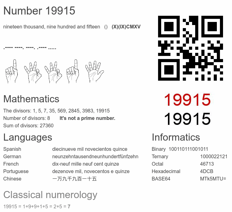 | Spanish: | 🔊 (número 19.915) | diecinueve mil novecientos quince |