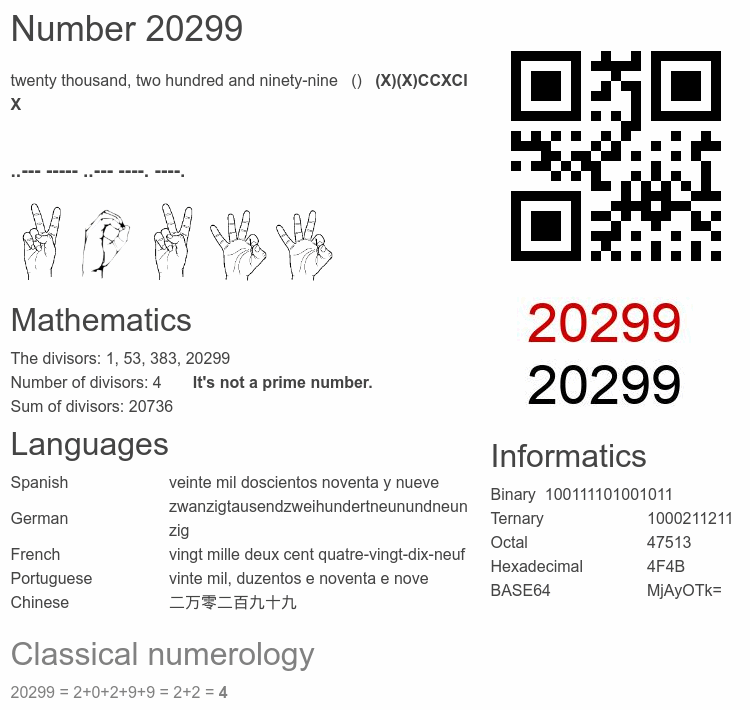 If you know something interesting about the number 20299 or any natural number (positive integer), please write to us.What is 20,299 in other units