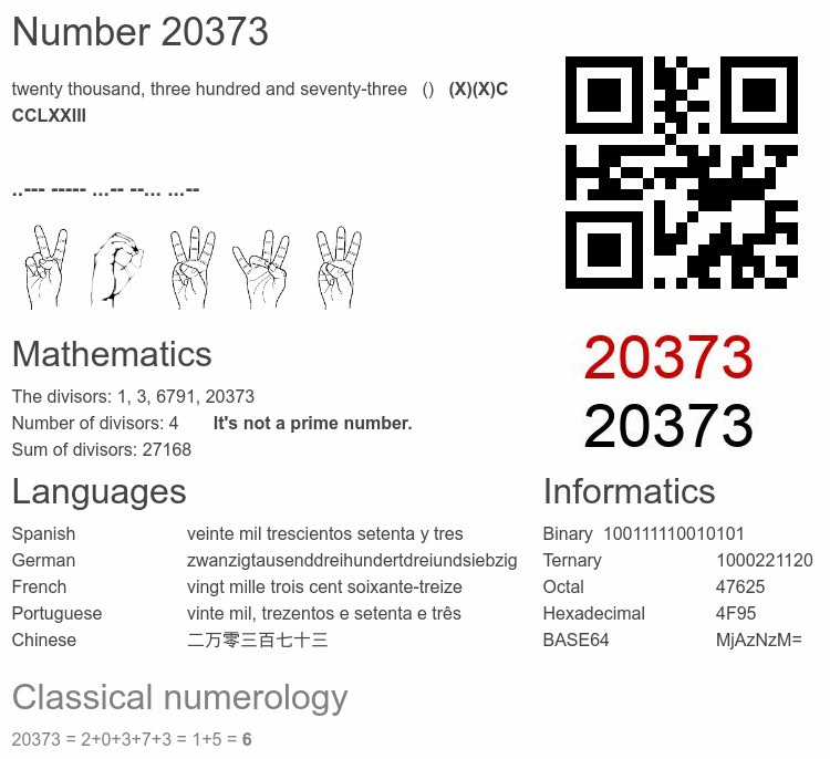 | French: | 🔊 (nombre 20 373) | vingt mille trois cent soixante-treize |