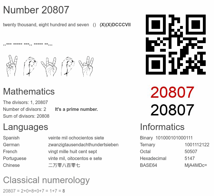 | French: | 🔊 (nombre 20 807) | vingt mille huit cent sept |
