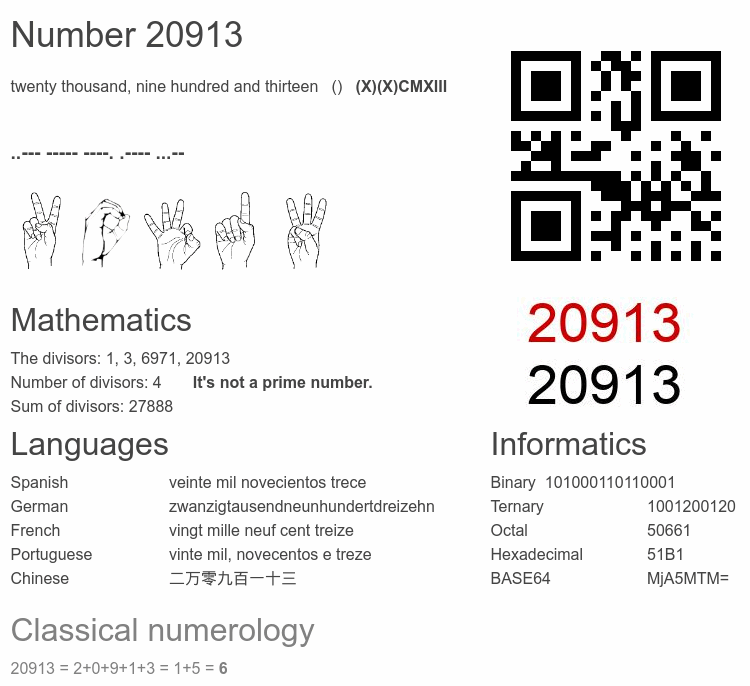 | Spanish: | 🔊 (número 20.913) | veinte mil novecientos trece |