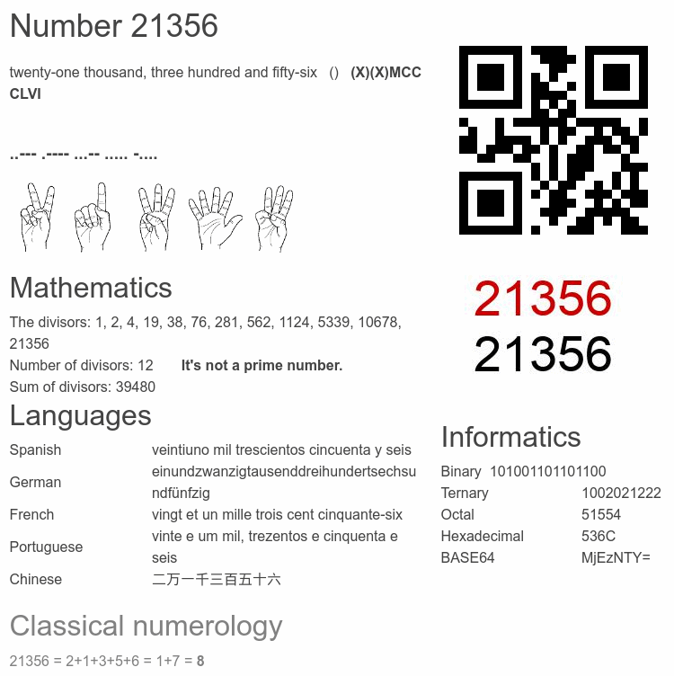 | Portuguese: | 🔊 (número 21 356) | vinte e um mil, trezentos e cinquenta e seis |