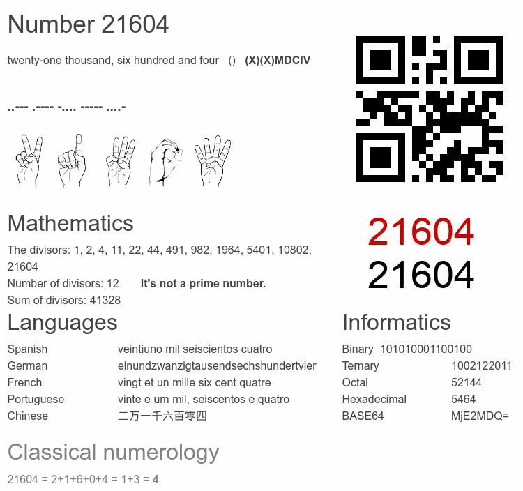 | French: | 🔊 (nombre 21 604) | vingt et un mille six cent quatre |