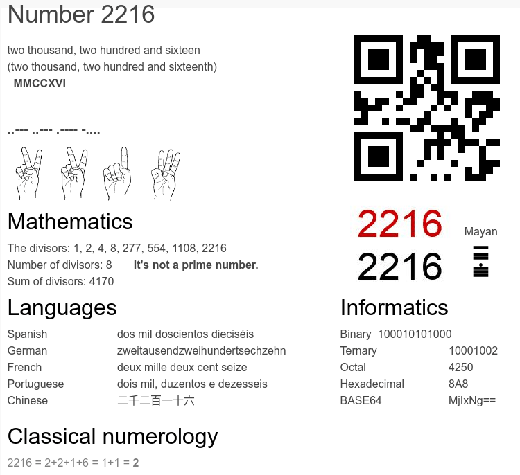 The even number 2,216 is spelled 🔊, and written in words: two thousand, two hundred and sixteen. The ordinal number 2216th is said 🔊 and written as: two thousand, two hundred and sixteenth. The meaning of the number 2216 in Maths: Is it Prime? Factorization and prime factors tree. The square root and cube root of 2216. What is 2216 in computer science, numerology, codes and images, writing and naming in other languages. Other interesting facts, news related to 2216.