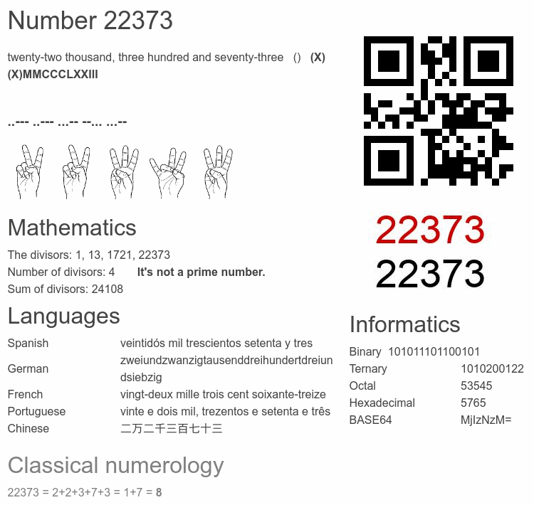 | French: | 🔊 (nombre 22 373) | vingt-deux mille trois cent soixante-treize |