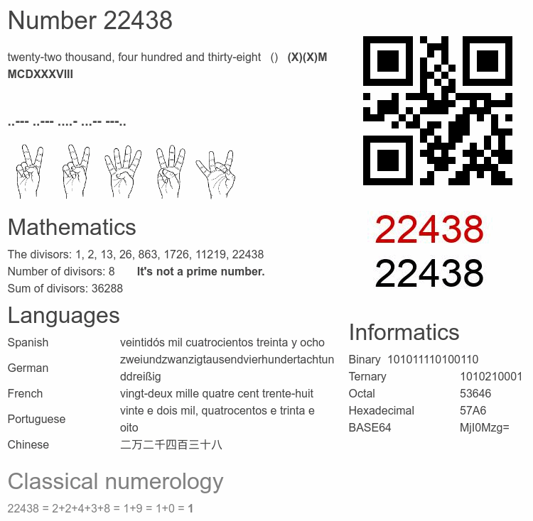 The even number 22,438 is spelled 🔊, and written in words: twenty-two thousand, four hundred and thirty-eight. The ordinal number 22438th is said 🔊 and written as: twenty-two thousand, four hundred and thirty-eighth. The meaning of the number 22438 in Maths: Is it Prime? Factorization and prime factors tree. The square root and cube root of 22438. What is 22438 in computer science, numerology, codes and images, writing and naming in other languages. Other interesting facts related to 22438.