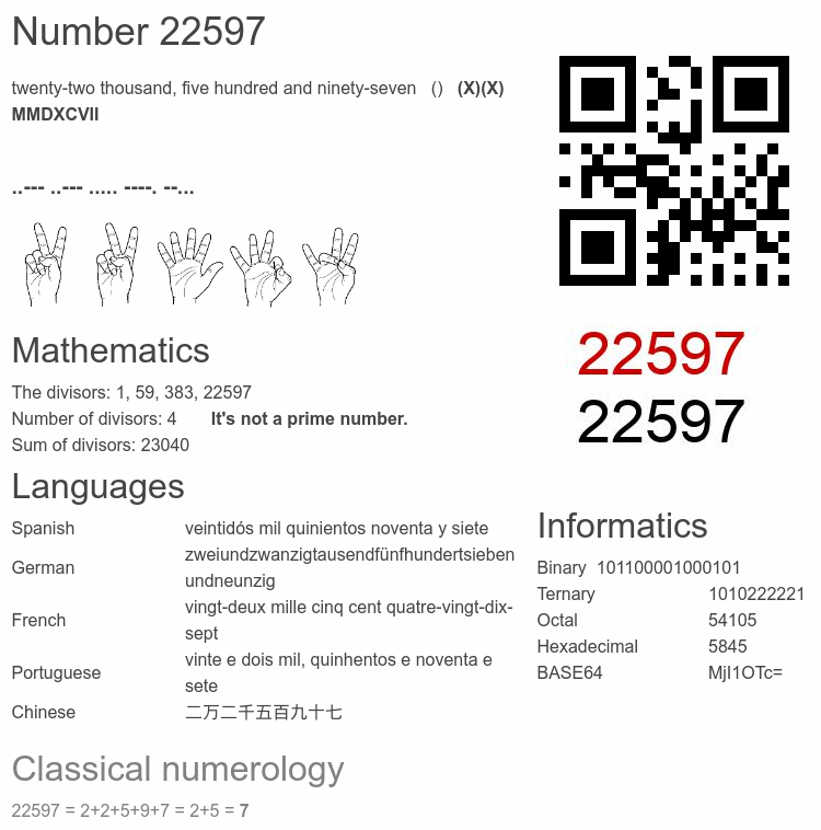 If you know something interesting about the number 22597 or any natural number (positive integer), please write to us.What is 22,597 in other units