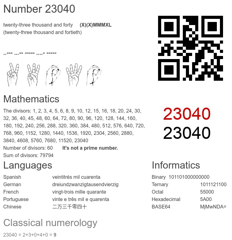 If you know something interesting about the 23040 number that you did not find on this page, do not hesitate to write us here.