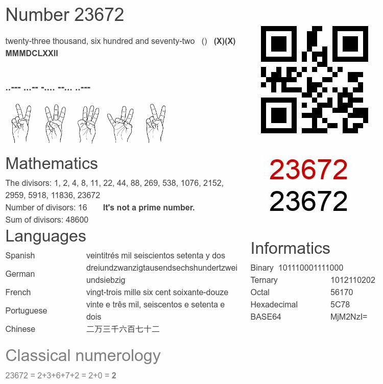 The even number 23,672 is spelled 🔊, and written in words: twenty-three thousand, six hundred and seventy-two. The ordinal number 23672nd is said 🔊 and written as: twenty-three thousand, six hundred and seventy-second. The meaning of the number 23672 in Maths: Is it Prime? Factorization and prime factors tree. The square root and cube root of 23672. What is 23672 in computer science, numerology, codes and images, writing and naming in other languages. Other interesting facts related to 23672.