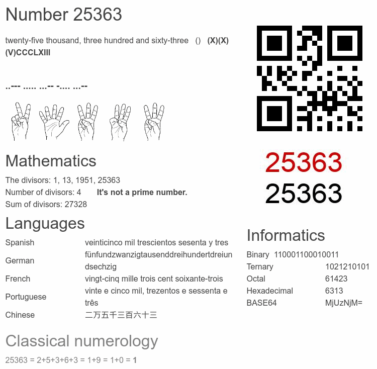 | French: | 🔊 (nombre 25 363) | vingt-cinq mille trois cent soixante-trois |
