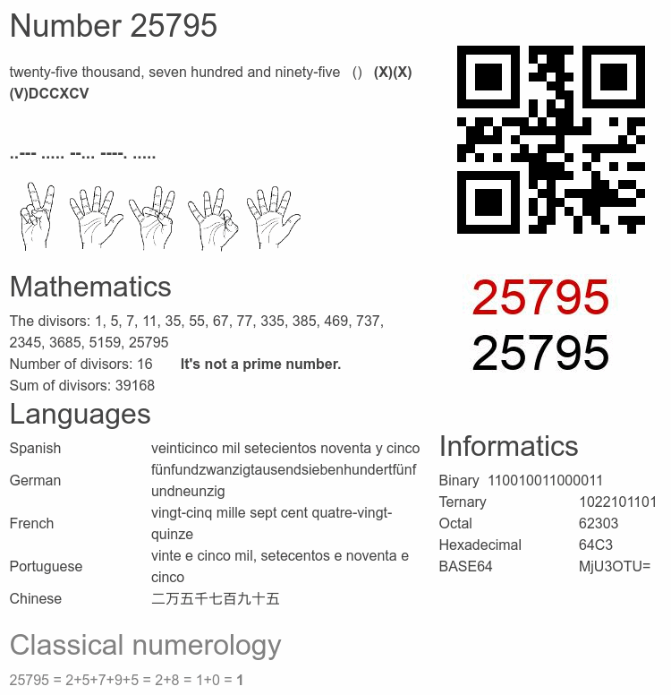 | Spanish: | 🔊 (número 25.795) | veinticinco mil setecientos noventa y cinco |