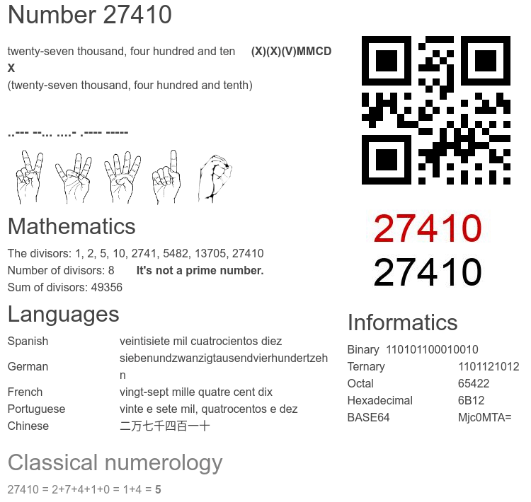 The even number 27,410 is spelled 🔊, and written in words: twenty-seven thousand, four hundred and ten. The ordinal number 27410th is said 🔊 and written as: twenty-seven thousand, four hundred and tenth. The meaning of the number 27410 in Maths: Is it Prime? Factorization and prime factors tree. The square root and cube root of 27410. What is 27410 in computer science, numerology, codes and images, writing and naming in other languages. Other interesting facts related to 27410.