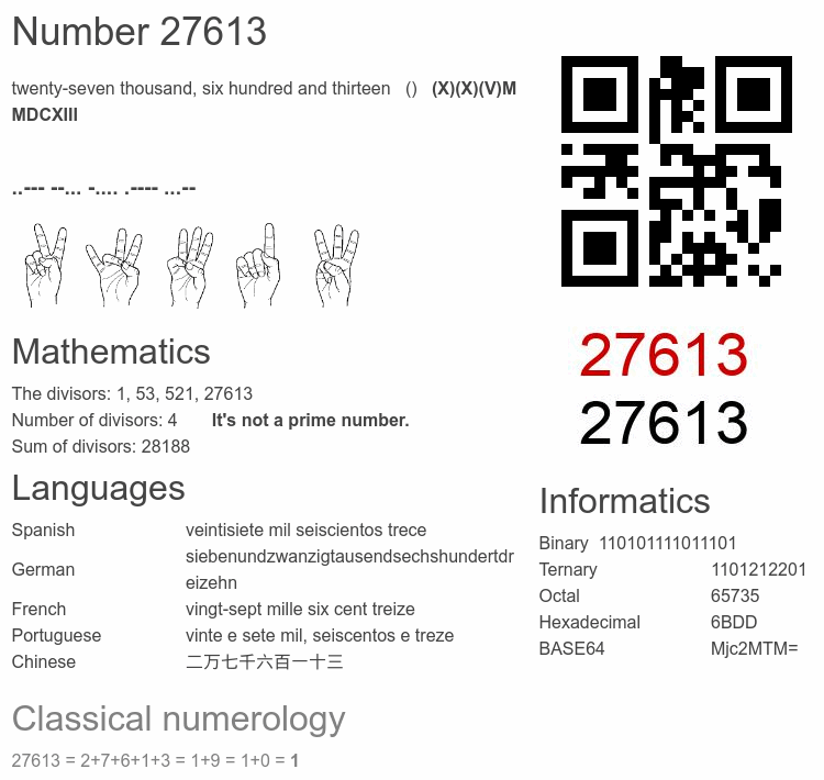 | Portuguese: | 🔊 (número 27 613) | vinte e sete mil, seiscentos e treze |