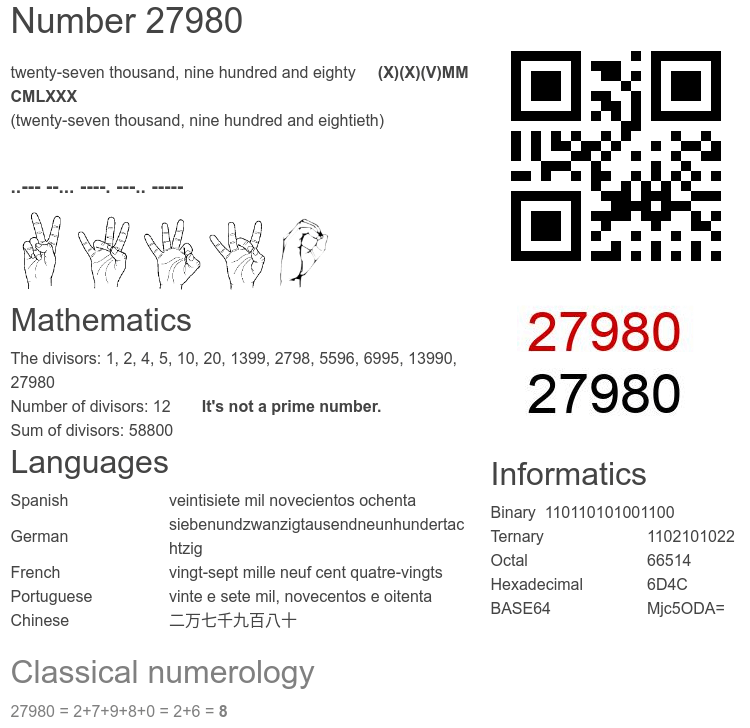 The even number 27,980 is spelled 🔊, and written in words: twenty-seven thousand, nine hundred and eighty. The ordinal number 27980th is said 🔊 and written as: twenty-seven thousand, nine hundred and eightieth. The meaning of the number 27980 in Maths: Is it Prime? Factorization and prime factors tree. The square root and cube root of 27980. What is 27980 in computer science, numerology, codes and images, writing and naming in other languages. Other interesting facts related to 27980.