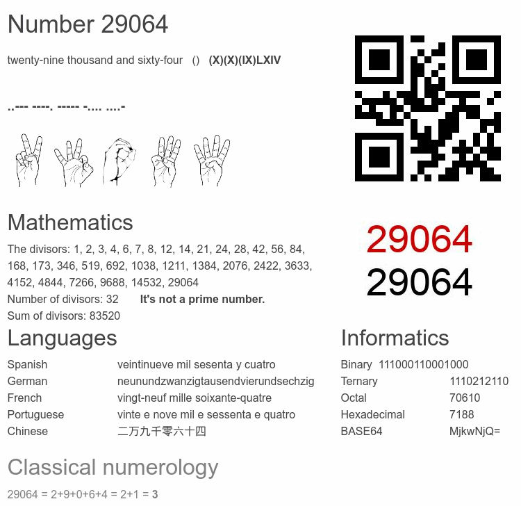 | Spanish: | 🔊 (número 29.064) | veintinueve mil sesenta y cuatro |