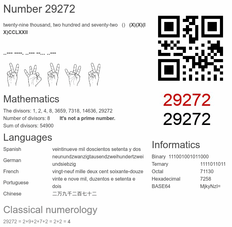 The even number 29,272 is spelled 🔊, and written in words: twenty-nine thousand, two hundred and seventy-two. The ordinal number 29272nd is said 🔊 and written as: twenty-nine thousand, two hundred and seventy-second. The meaning of the number 29272 in Maths: Is it Prime? Factorization and prime factors tree. The square root and cube root of 29272. What is 29272 in computer science, numerology, codes and images, writing and naming in other languages. Other interesting facts related to 29272.
