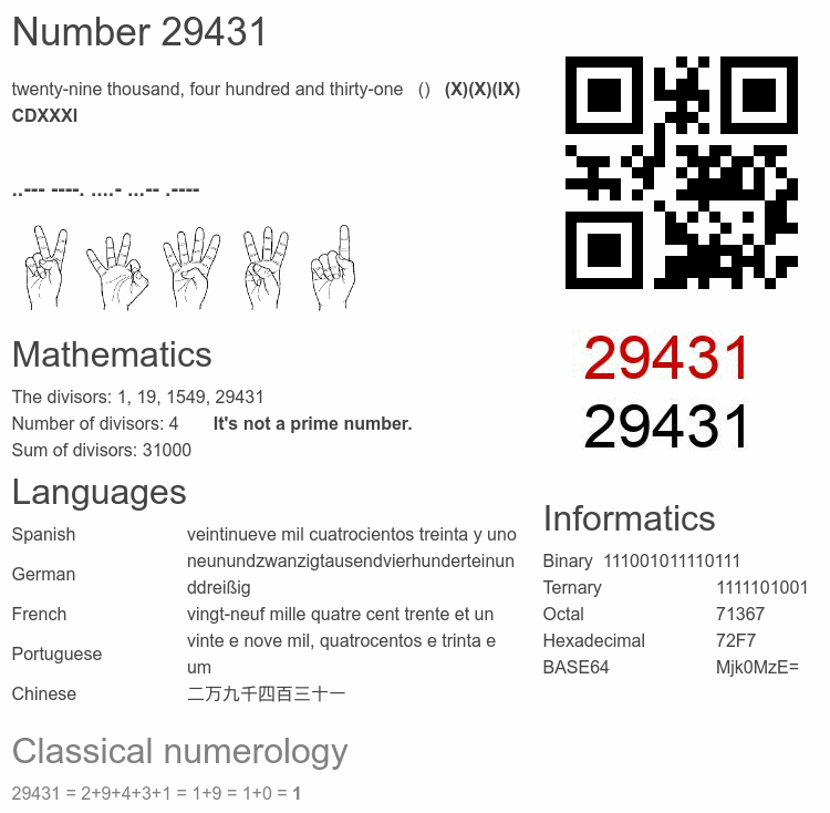 | Portuguese: | 🔊 (número 29 431) | vinte e nove mil, quatrocentos e trinta e um |