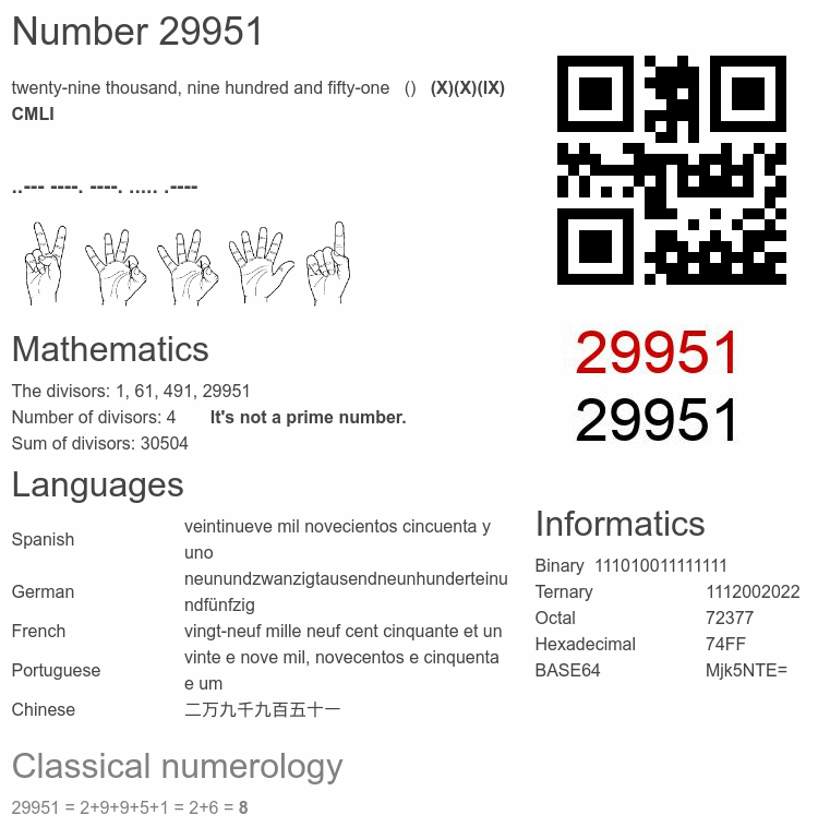 If you know something interesting about the number 29951 or any natural number (positive integer), please write to us.What is 29,951 in other units