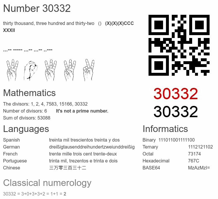 The even number 30,332 is spelled 🔊, and written in words: thirty thousand, three hundred and thirty-two. The ordinal number 30332nd is said 🔊 and written as: thirty thousand, three hundred and thirty-second. The meaning of the number 30332 in Maths: Is it Prime? Factorization and prime factors tree. The square root and cube root of 30332. What is 30332 in computer science, numerology, codes and images, writing and naming in other languages. Other interesting facts related to 30332.