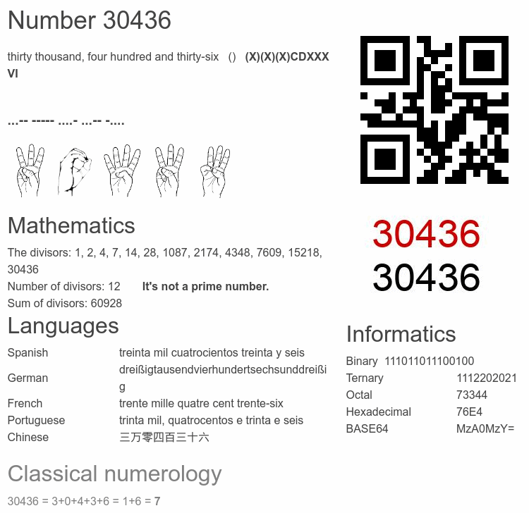 The even number 30,436 is spelled 🔊, and written in words: thirty thousand, four hundred and thirty-six. The ordinal number 30436th is said 🔊 and written as: thirty thousand, four hundred and thirty-sixth. The meaning of the number 30436 in Maths: Is it Prime? Factorization and prime factors tree. The square root and cube root of 30436. What is 30436 in computer science, numerology, codes and images, writing and naming in other languages. Other interesting facts related to 30436.