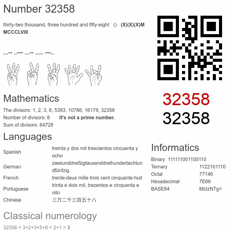 The even number 32,358 is spelled 🔊, and written in words: thirty-two thousand, three hundred and fifty-eight. The ordinal number 32358th is said 🔊 and written as: thirty-two thousand, three hundred and fifty-eighth. The meaning of the number 32358 in Maths: Is it Prime? Factorization and prime factors tree. The square root and cube root of 32358. What is 32358 in computer science, numerology, codes and images, writing and naming in other languages. Other interesting facts related to 32358.