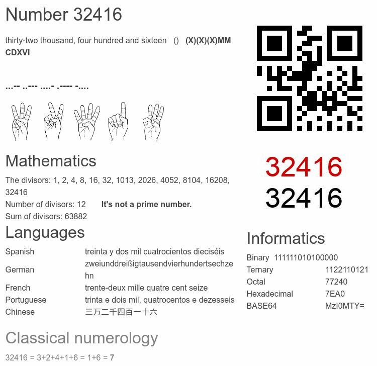 | Portuguese: | 🔊 (número 32 416) | trinta e dois mil, quatrocentos e dezesseis |