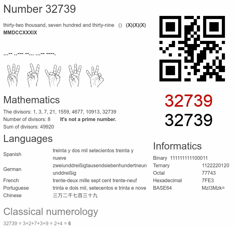The odd number 32,739 is spelled 🔊, and written in words: thirty-two thousand, seven hundred and thirty-nine. The ordinal number 32739th is said 🔊 and written as: thirty-two thousand, seven hundred and thirty-ninth. The meaning of the number 32739 in Maths: Is it Prime? Factorization and prime factors tree. The square root and cube root of 32739. What is 32739 in computer science, numerology, codes and images, writing and naming in other languages. Other interesting facts related to 32739.