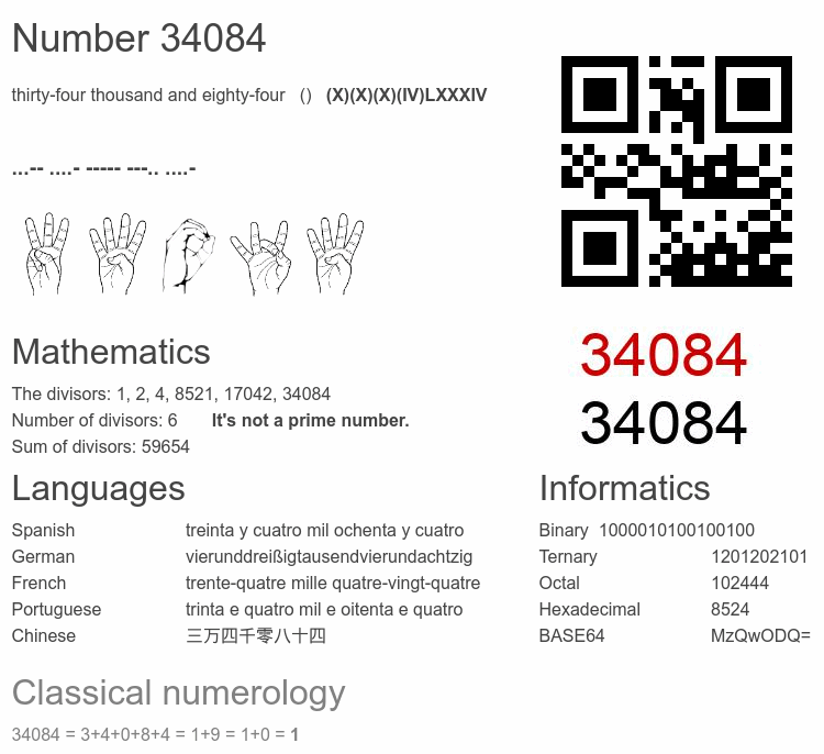| Portuguese: | 🔊 (número 34 084) | trinta e quatro mil e oitenta e quatro |
