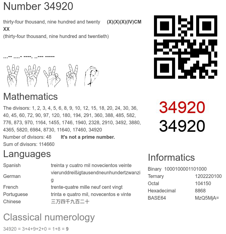 The even number 34,920 is spelled 🔊, and written in words: thirty-four thousand, nine hundred and twenty. The ordinal number 34920th is said 🔊 and written as: thirty-four thousand, nine hundred and twentieth. The meaning of the number 34920 in Maths: Is it Prime? Factorization and prime factors tree. The square root and cube root of 34920. What is 34920 in computer science, numerology, codes and images, writing and naming in other languages. Other interesting facts related to 34920.