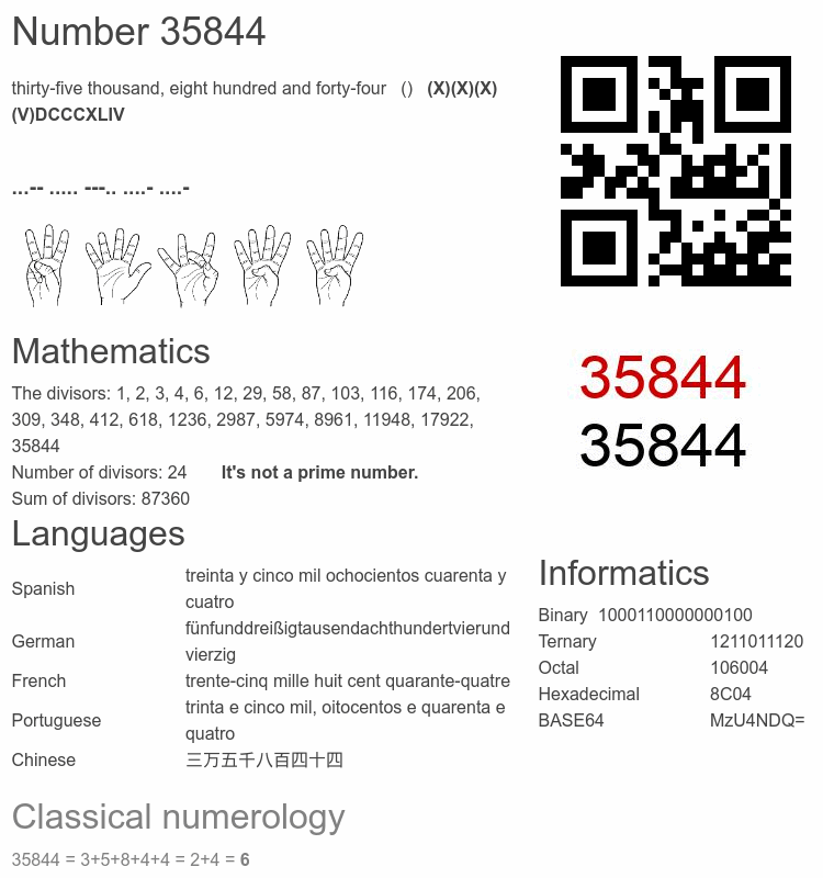 | Portuguese: | 🔊 (número 35 844) | trinta e cinco mil, oitocentos e quarenta e quatro |