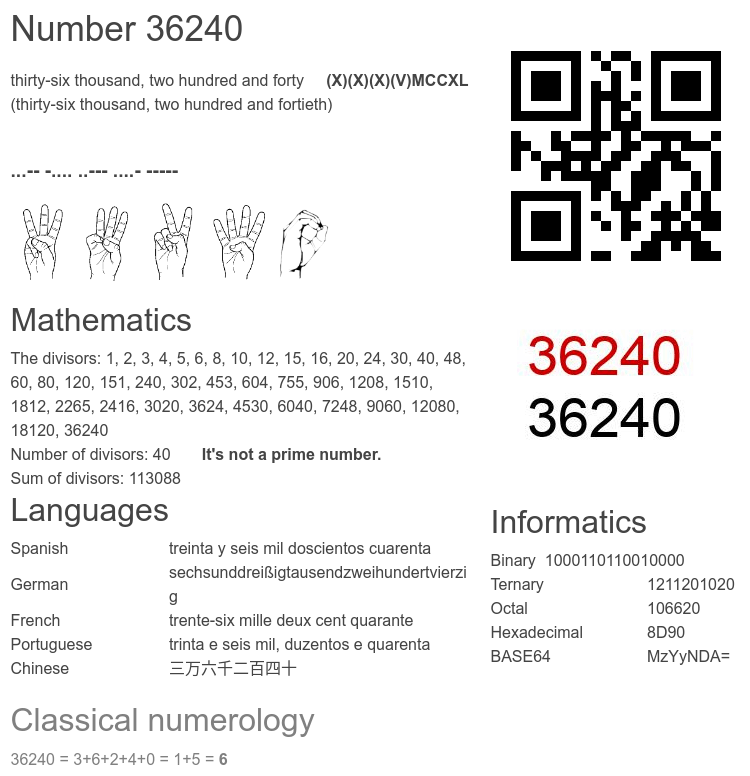 The even number 36,240 is spelled 🔊, and written in words: thirty-six thousand, two hundred and forty. The ordinal number 36240th is said 🔊 and written as: thirty-six thousand, two hundred and fortieth. The meaning of the number 36240 in Maths: Is it Prime? Factorization and prime factors tree. The square root and cube root of 36240. What is 36240 in computer science, numerology, codes and images, writing and naming in other languages. Other interesting facts related to 36240.