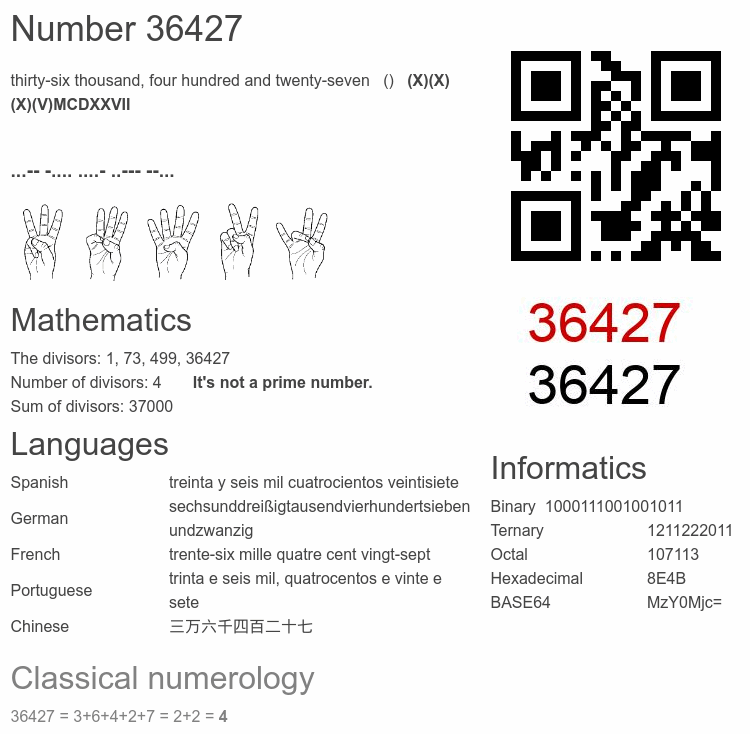 | Spanish: | 🔊 (número 36.427) | treinta y seis mil cuatrocientos veintisiete |